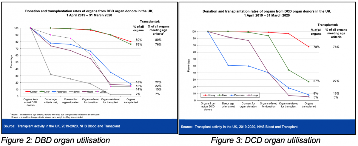 Of the donor organs which meet basic transplantability criteria only 76% of eligible DBD livers and 27% of DCD livers are ultimately transplanted (Figures 2 & 3). Part of this discrepancy can be accounted for by donor characteristics, with a greater proportion of the donor population being considered marginal either due to donor type (DCD) or other characteristics (age, co-morbidities, prolonged ITU stay etc.).