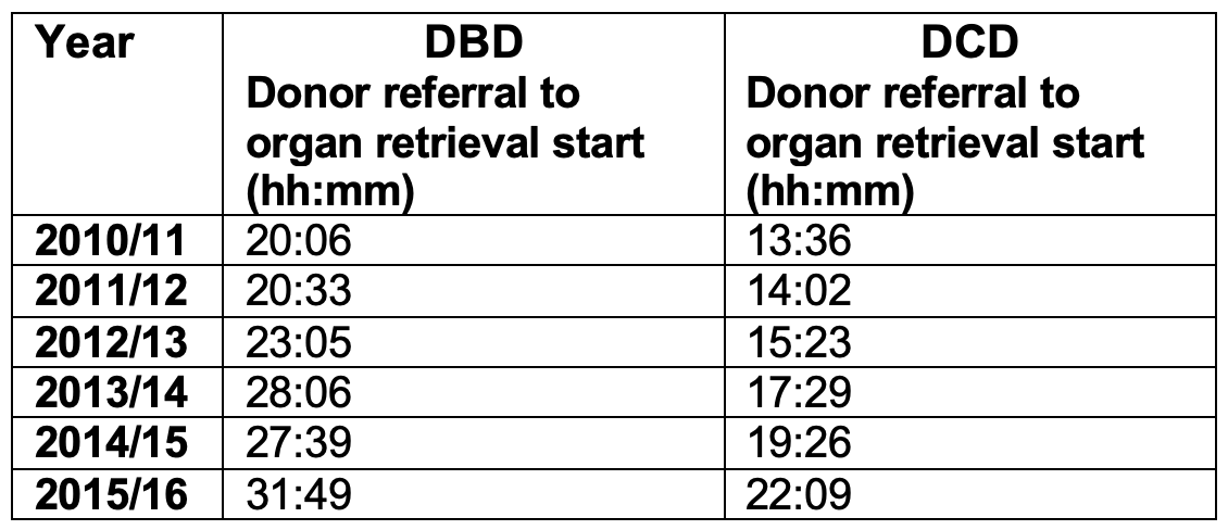 Organ donation has become progressively more prolonged over the past decade (Table 1) with the time taken from donor referral to the start of organ retrieval increasing by over 50% from 2010 to 2016.